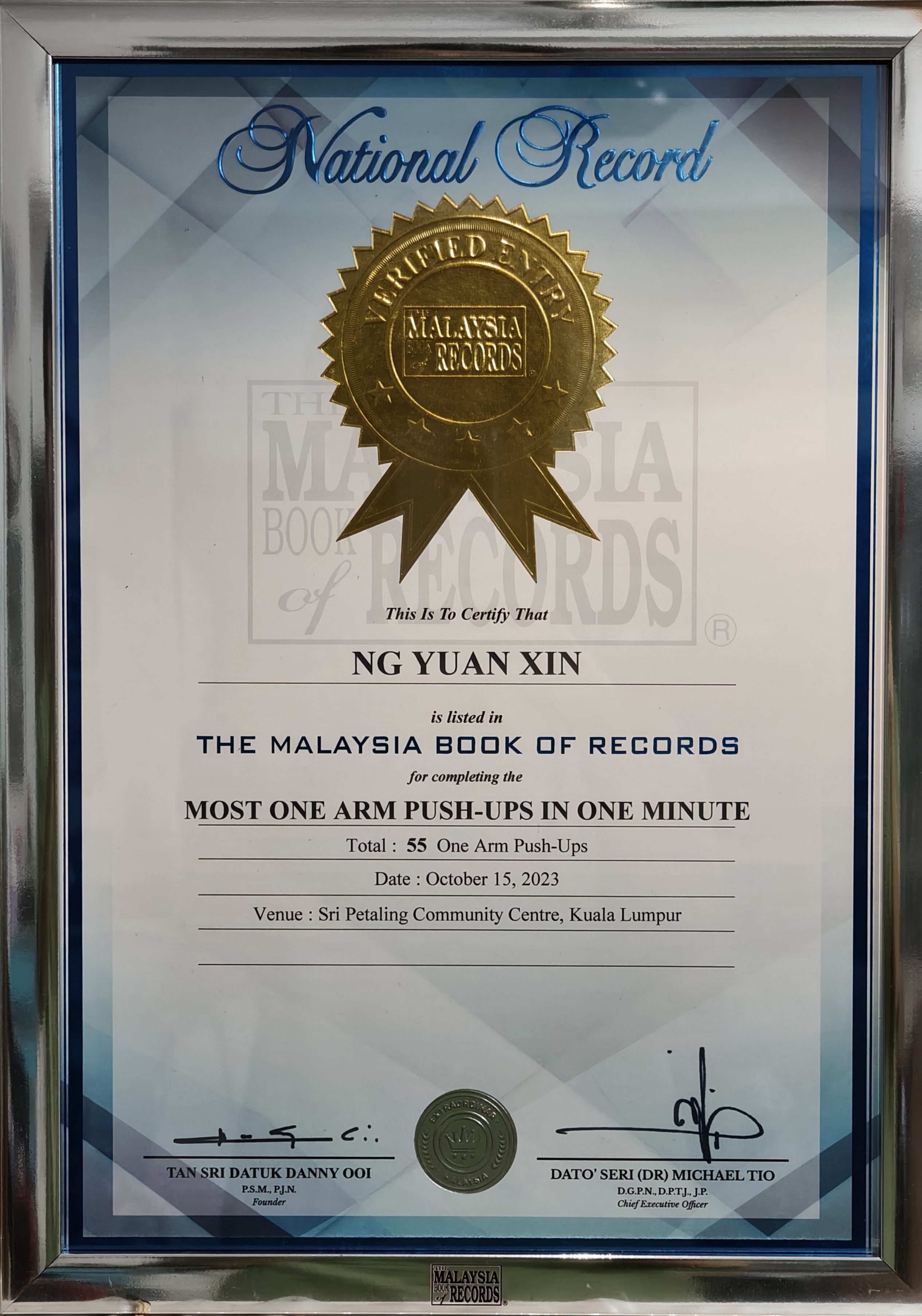 Officially recognized for setting a national record by completing the most one-arm push-ups in one minute (60 pushups), demonstrating exceptional physical strength, discipline, and determination.